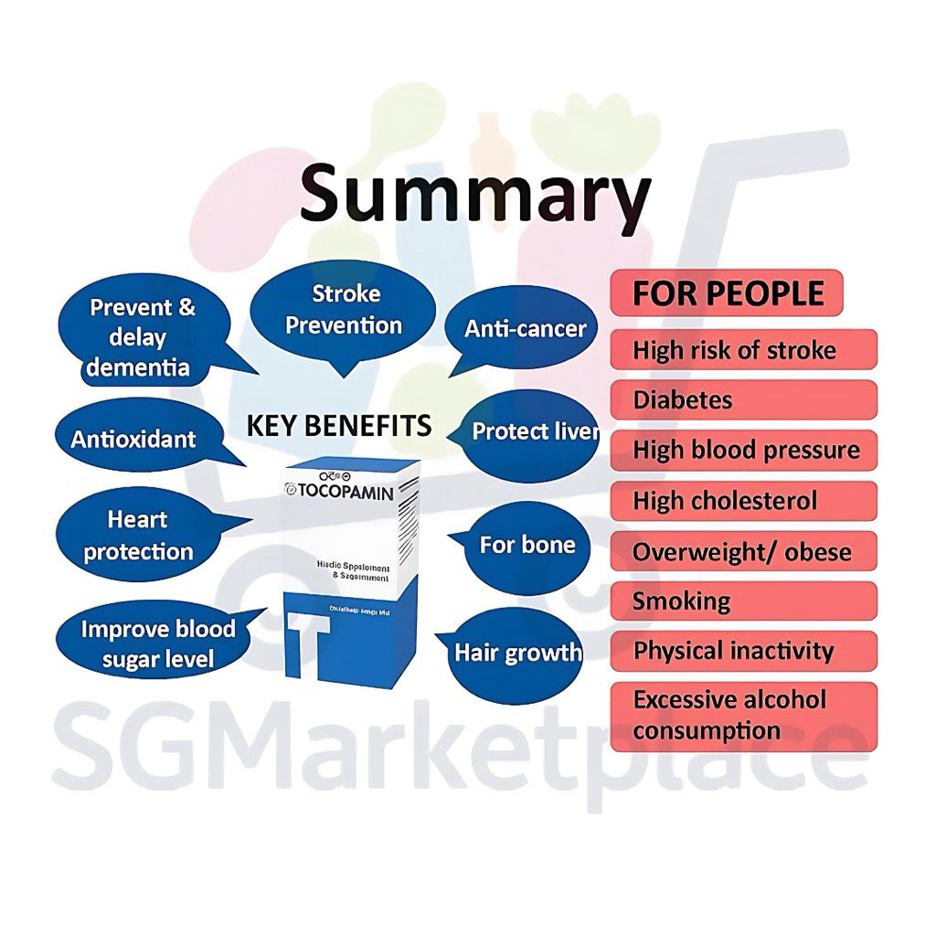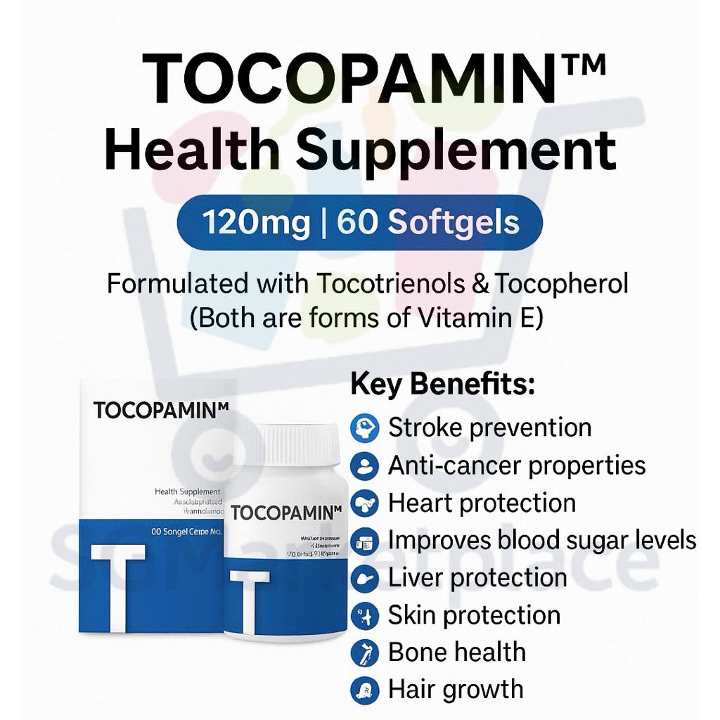 TOCOPAMIN™ Health Supplement, which primarily contains Tocotrienols & Tocopherol (forms of Vitamin E), is formulated to support overall wellness and protect against oxidative stress.